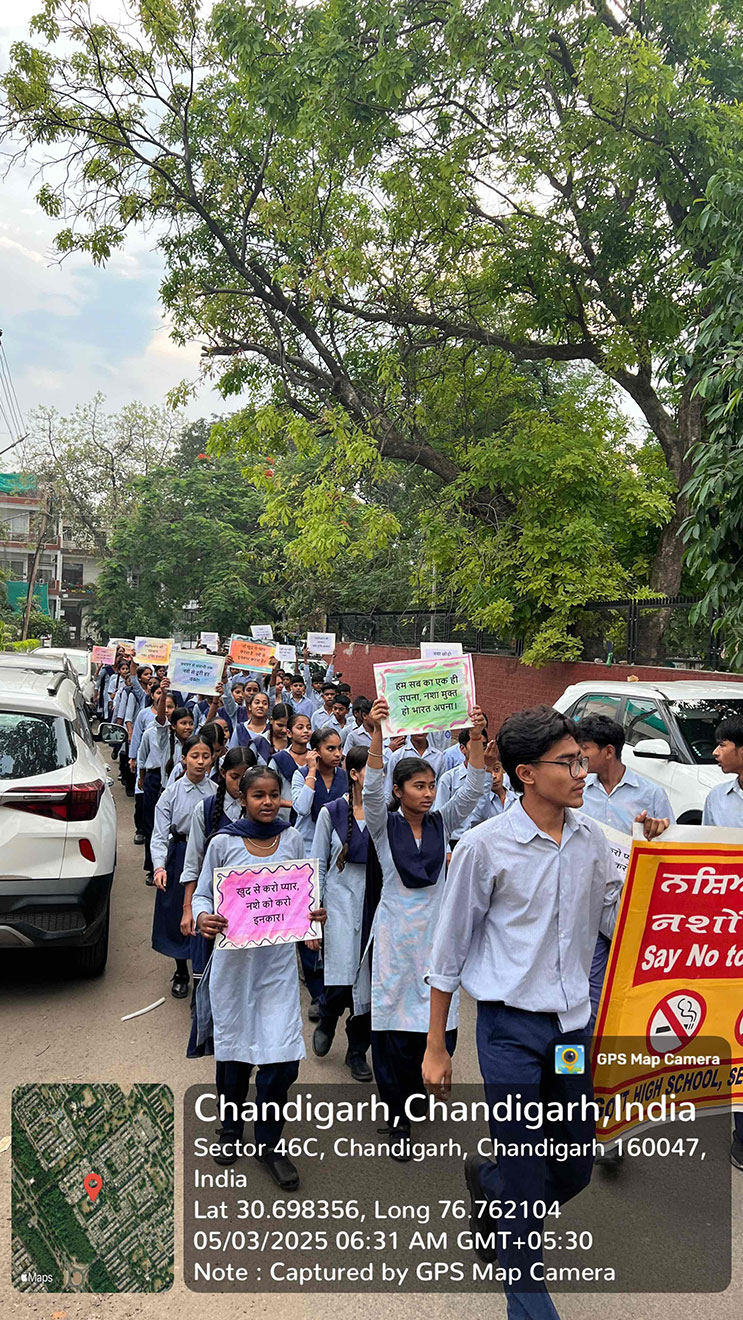 Anti drug campaign to celebrate state level Nasha Mukti event VADA (Victory Against Drug Abuse) was organised in GHS 46C, Chandigarh on 3rd May,2025. Rally was organised by the school in which more than 150 students along with the teachers participated with great enthusiasm under the leadership of the head of the institute S. Rajinder Singh. Rally was conducted in the vicinity of the school covering the area of approximately 1.5 km.